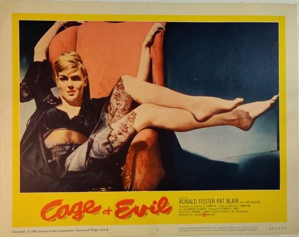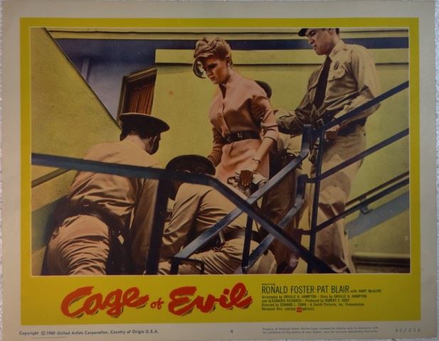 Cage of Evil (United Artists, 1960) lobby card. Drama, Crime. Starring Ron Foster, Patricia Blair, Harp McGuire, John Maxwell, Preston Hanson, Douglas Henderson, Hugh Sanders, Helen Kleeb, Robert Shayne, Owen Bush, Eve Brent. Directed by Edward L. Cahn. Very minor edge wear, very minor creases. Excellent. (11"x14").