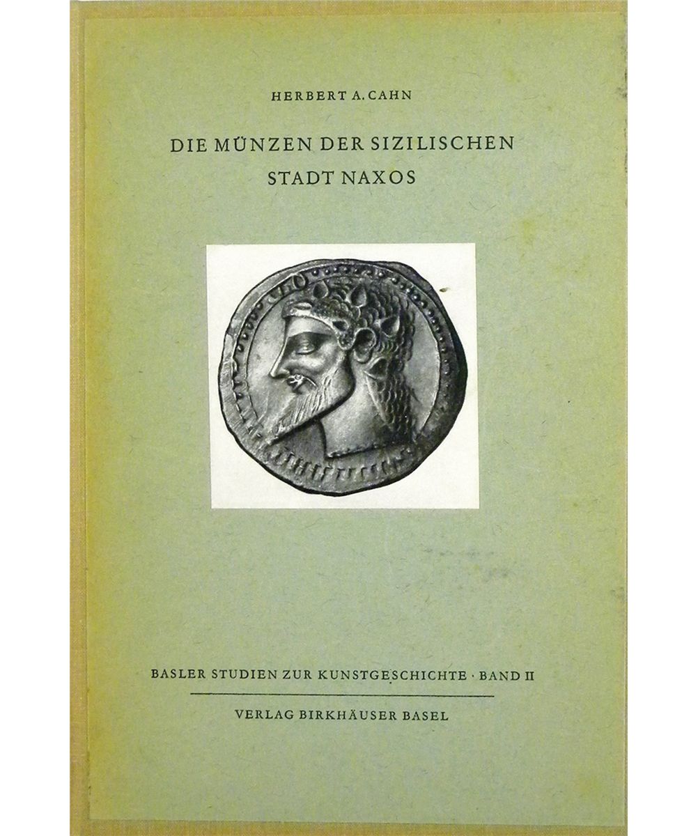 Cahn, Herbert A. DIE MÜNZEN DER SIZILISCHEN STADT NAXOS. EIN BEITRAG ZUR KUNSTGESCHICHTE DES GRIECHISCHEN WESTENS. Basel, 1944. 8vo, recent tan linen, lettered and ruled in brown; original printed front card cover mounted on front board. 168 pages; 12 fine plates. Fine. A recently bound copy of this major work. Clain-Stefanelli 2246*: "Emphasizes economic as well as artistic aspects." Grierson 63. Kroh 20 (five stars): "an excellent die-corpus ... and still the standard reference."