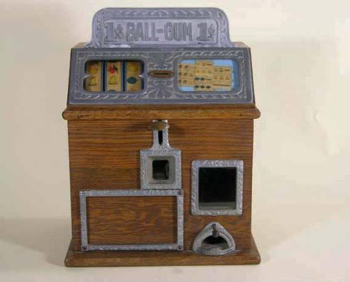 "Caille" 3 reel oak cabinet - trade stimulator with 1 cent gumball vendor. ex. cond., works.