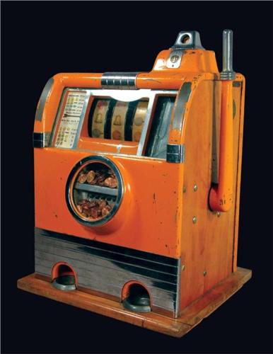 Caille One Cent Cadet Slot Machine, orange enamel. 14 X 21 X 14 inches.