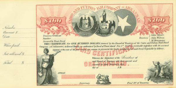 Arkansas Red/Black. $100 Bond Top center vignette of State Seals from Missouri, Arkansas, and Texas. Bottom left vignette of female allegorical figure with shield. Bottom right Indian riding horseback. Bottom center vignette of bag of money with key. Unissued. A truly great looking colorful certificate. Excellent condition.