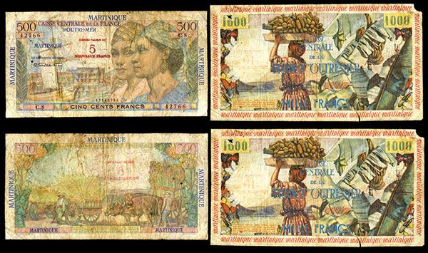 Martinique, pair of 2 issued notes, includes 5 10 Nouveaux Francs, P-38, Fine with edge tear; and 10 Nouveaux Francs, P-39, VG with hole near top right corner, missing top left corner portion, and small edge tear near bottom.