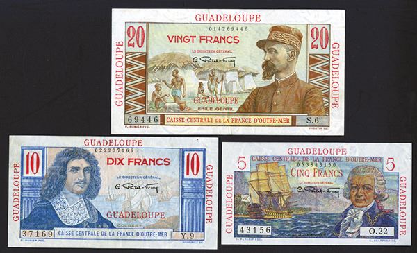 Guadeloupe. 5, 10, 20 Francs. SCWPM 32, 32, 33. First Very Fine or better, second and third Very Fine to Choice VF. Crisp, bright and fresh appearing. 3 pieces.