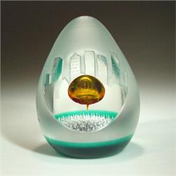 Caithness Glass "City Limits" high-domed paperweight, with a central golden bubble above a layer of tiny white spires, on aqua flash ground; frosted exterior with engraved city skyline. Tilted oval front facet. Signed. #11 of limited edition of 125 in 1999. Height 4".