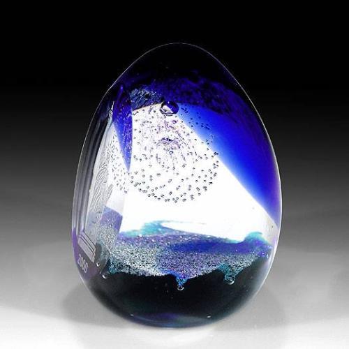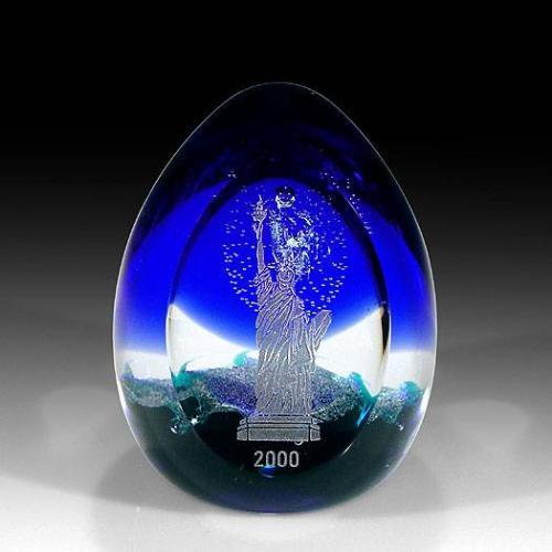 Caithness Glass 2000 "Millennium Liberty" weight, with dichroic bubbles depicting fireworks against a blue background; front facet engraved with the Statue of Liberty. Edition #48 of a limited edition of 350. Designed by Colin Terris, from the Millenium Collection. Height 3 3/4", diameter 3".