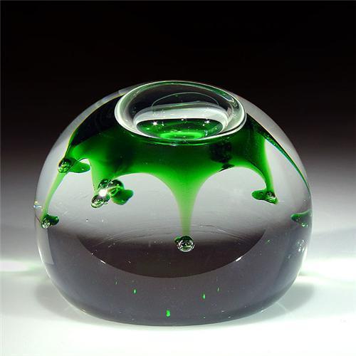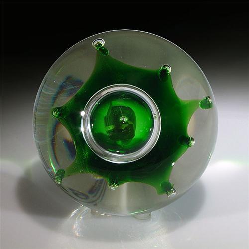 Caithness Glass 1976 "Spectre" abstract design paperweight. A large, low-domed bubble rests atop an abstract, translucent green eight-point star, which has a small bubble at the end of each point. The design is centered at the top of the piece, over clear ground. Signed/dated. Edition #52 of a limited edition of 1000. Designed by Colin Terris. Diameter 3 7/16". <p>Each winning bidder will receive one copy of "All About Paperweigths" and a paperweight stand for each paperweight won. (One book per winner, one stand per paperweight).