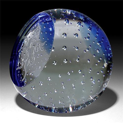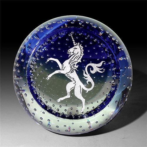 Caithness Glass 1997 "Silver Unicorn" paperweight. The piece has a silver unicorn engraved on the circular front facet, and a sphere of tiny spaced bubbles on the interior. Cobalt blue-flash background. Signed. Edition # 41 of a limited edition of 500. Designed by Colin Terris. Diameter 3 1/8". <p>Each winning bidder will receive one copy of "All About Paperweigths" and a paperweight stand for each paperweight won. (One book per winner, one stand per paperweight).