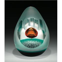 Caithness Glass "City Limits" high-domed cityscape paperweight, with a large golden bubble floating over tiny white shimmering spires, on translucent teal ground, and a city skyline etched into the frosted back. Tilted oval window facet. Designed by Alastair MacIntosh. Etching on base. LE #9 of 125. Height 3 13/16". $750-900