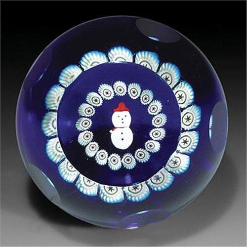 Caithness Glass 1987 "Miniature Snowman" paperweight. A snowman, wearing a red hat, is encircled by a garland of white star canes, on translucent cobalt blue ground. Five and one facets. Signed. Designed by Allan Scott. Diameter 2 1/4".