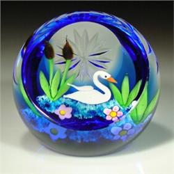Caithness Glass "Swan" paperweight, composed of a white bird, floating on a pond with cattails and water lilies, over translucent blue ground. Front facet and star-cut back facet. Signature cane. Limited edition of 150 in 1997. Designed by William Manson. Diameter 2 1/2".