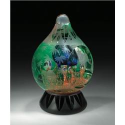 Caithness Glass "The Raj" teardrop-shaped abstract design paperweight, depicting an Indian palace of dichroic veils and bubbles in gold and silver, against a background of translucent emerald green, with Indian elephants and palm trees engraved on the exterior, over a footed base of translucent amber. Circular front facet. Signed on base. LE #46 of 50. Height 4 15/16". $1300-1500