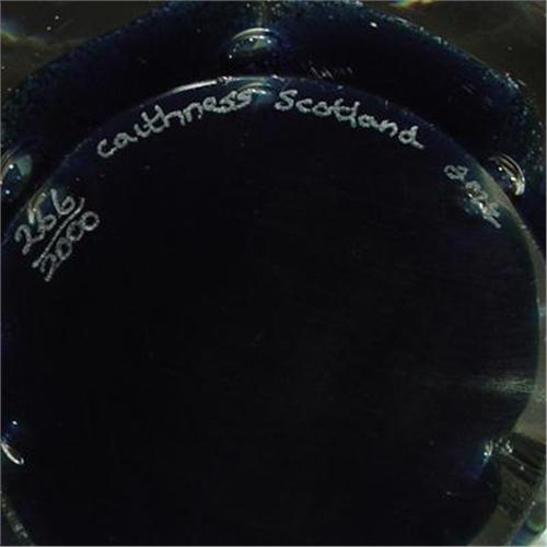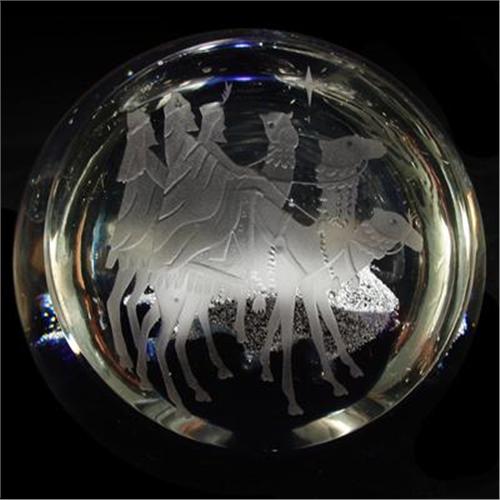 Caithness Glass 1978 "Journey of the Wise Men" engraved magnum paperweight. The images of the three Wise Men, on camels, are engraved on the tilted front facet of the piece. A veil of bubbles rests on a translucent cobalt blue cushion, on the weight's interior. Signed. Limited edition of 2000, designed by Helen MacDonald. Diameter 3 3/4".