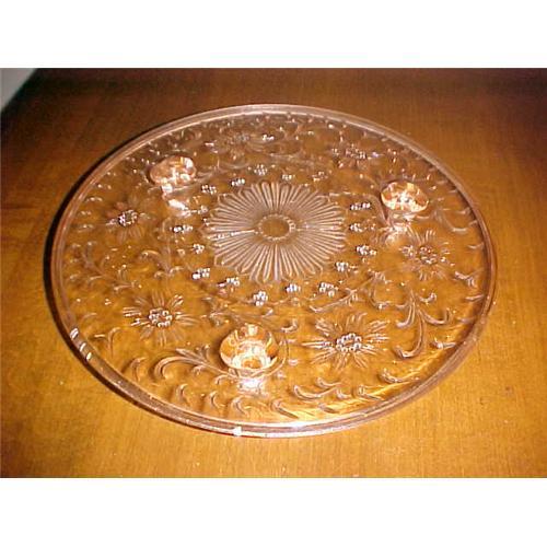 epression Cake Plate, Footed; 10" Diameter, embossed with flowers, Marked in Center-"Pat. Applied for" in circle; Unusual Piece, Beautiful