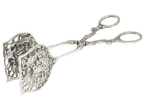 Silver, 71 g. Cast scissors. On the shovel there are puttos playing music. Marked: 800 purity, German, late 19th century. Length: 17 cm