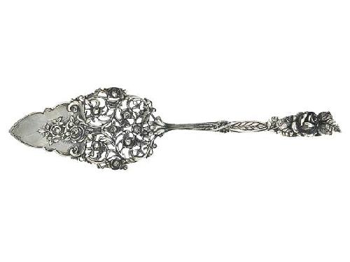Silver, 61 g. Cast, it is decorated with roses on the terminal and on the pierced scoop. Marked: 800 purity, 20th century. Length: 23.5 cm