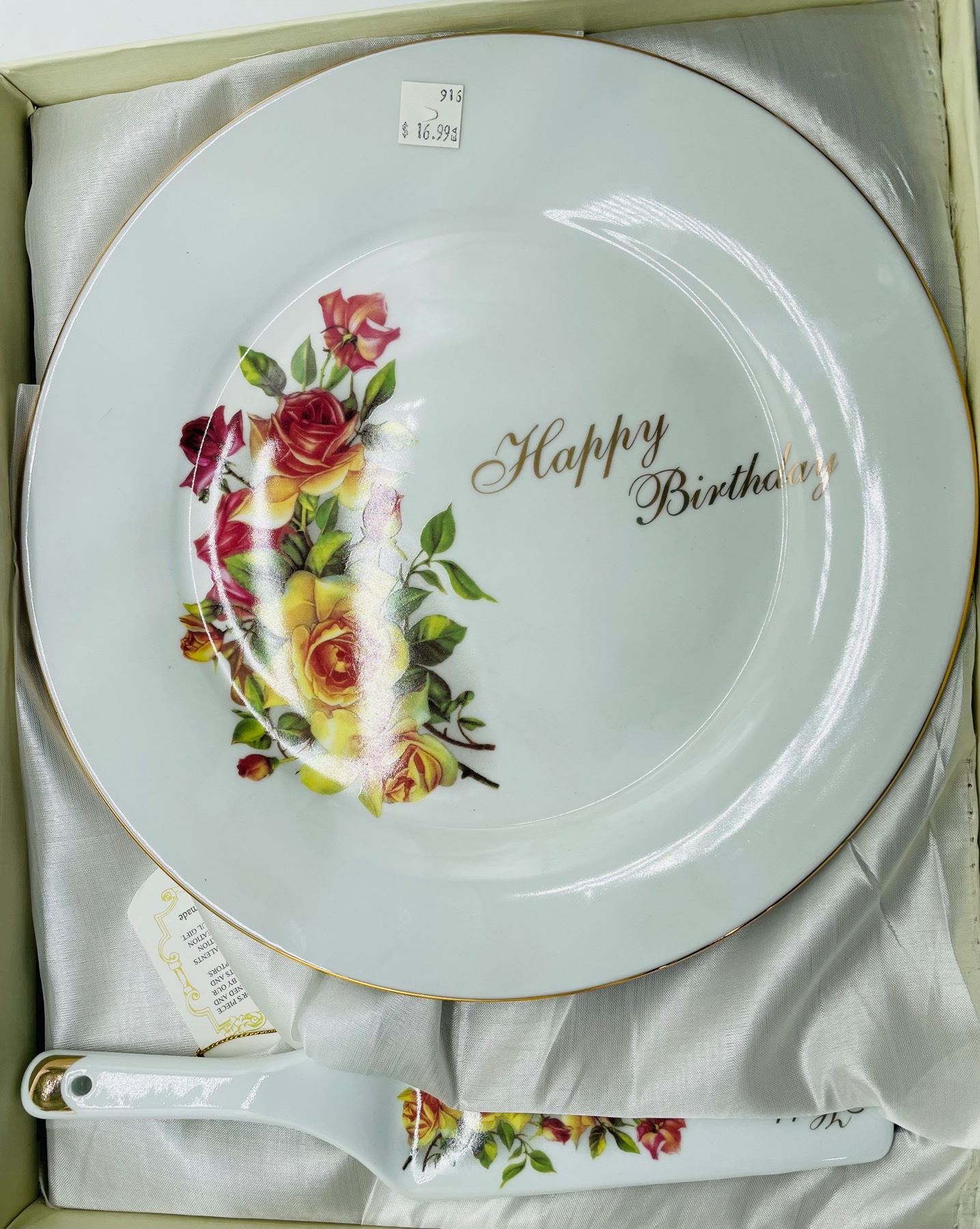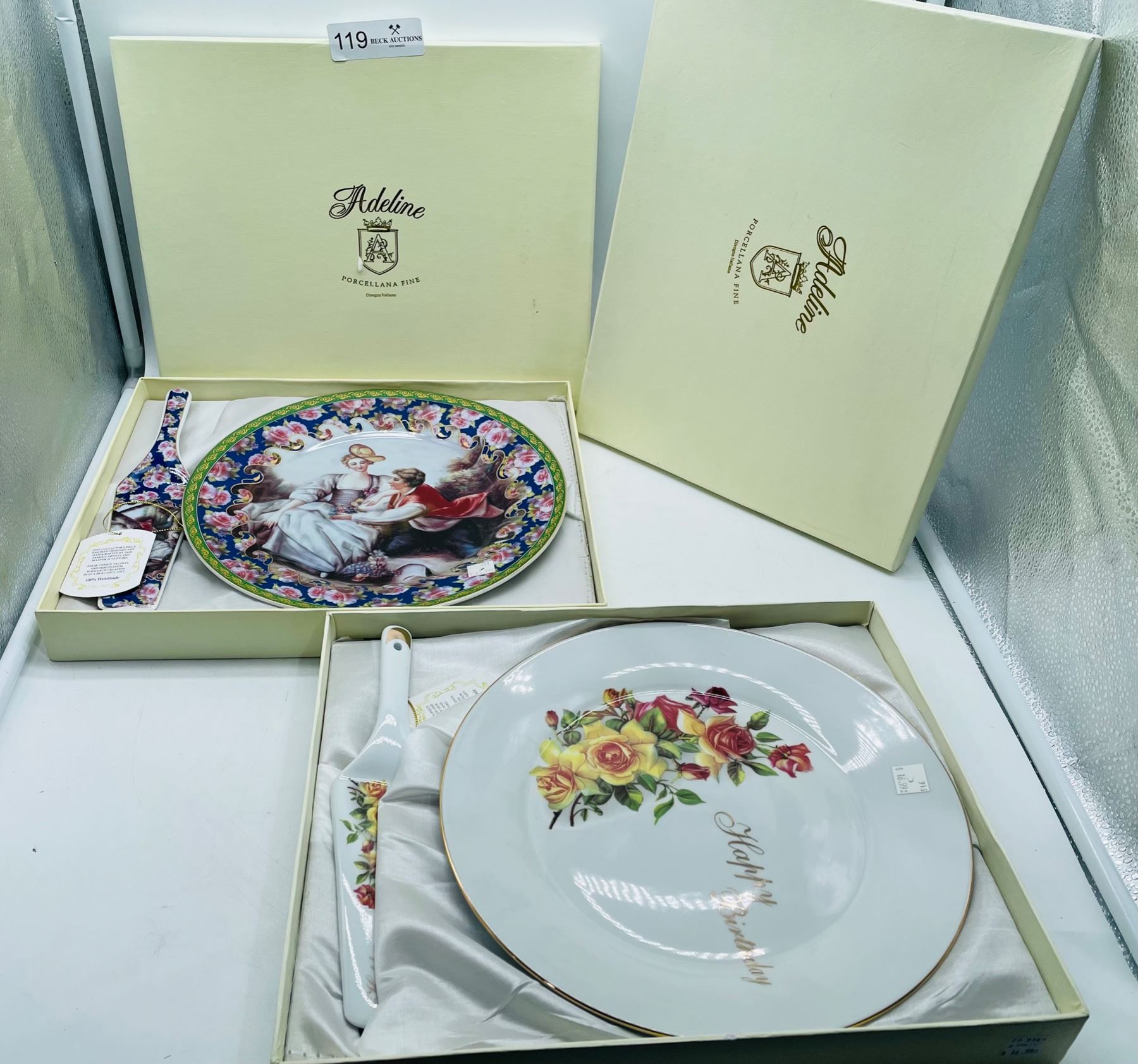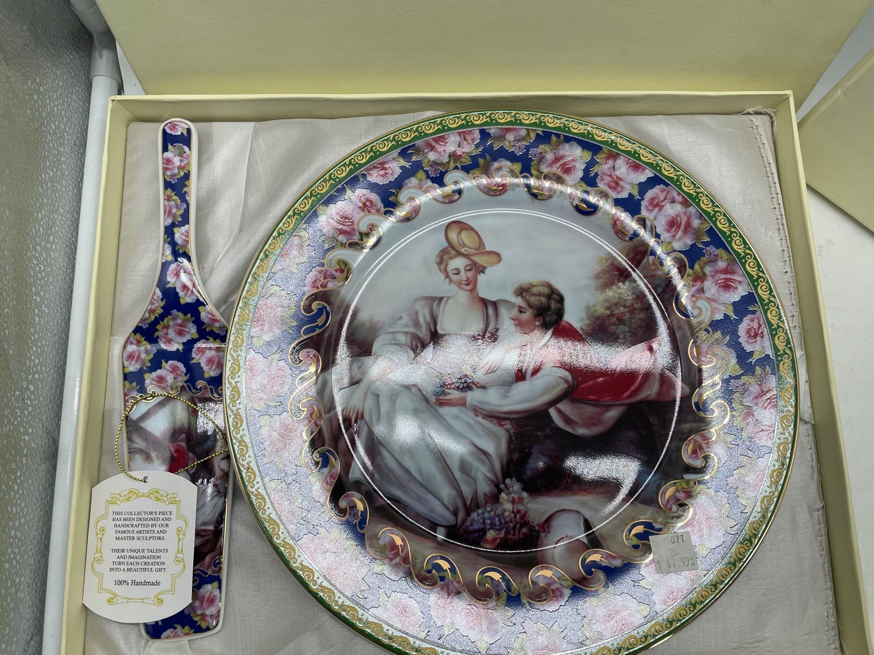 Two box sets of (10 - 1/2 inch across) cake or pie plates with serving knives in excellent condition.