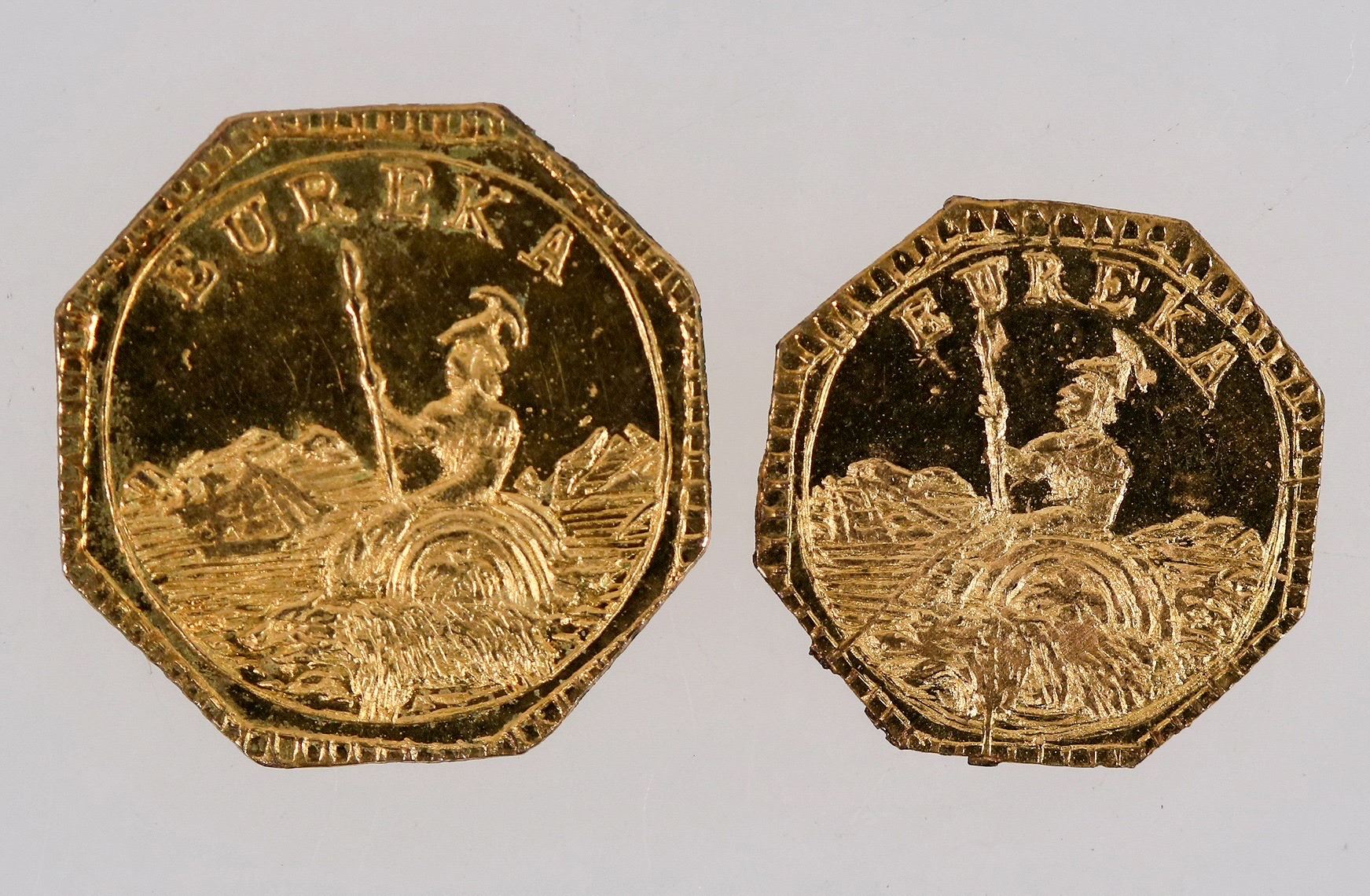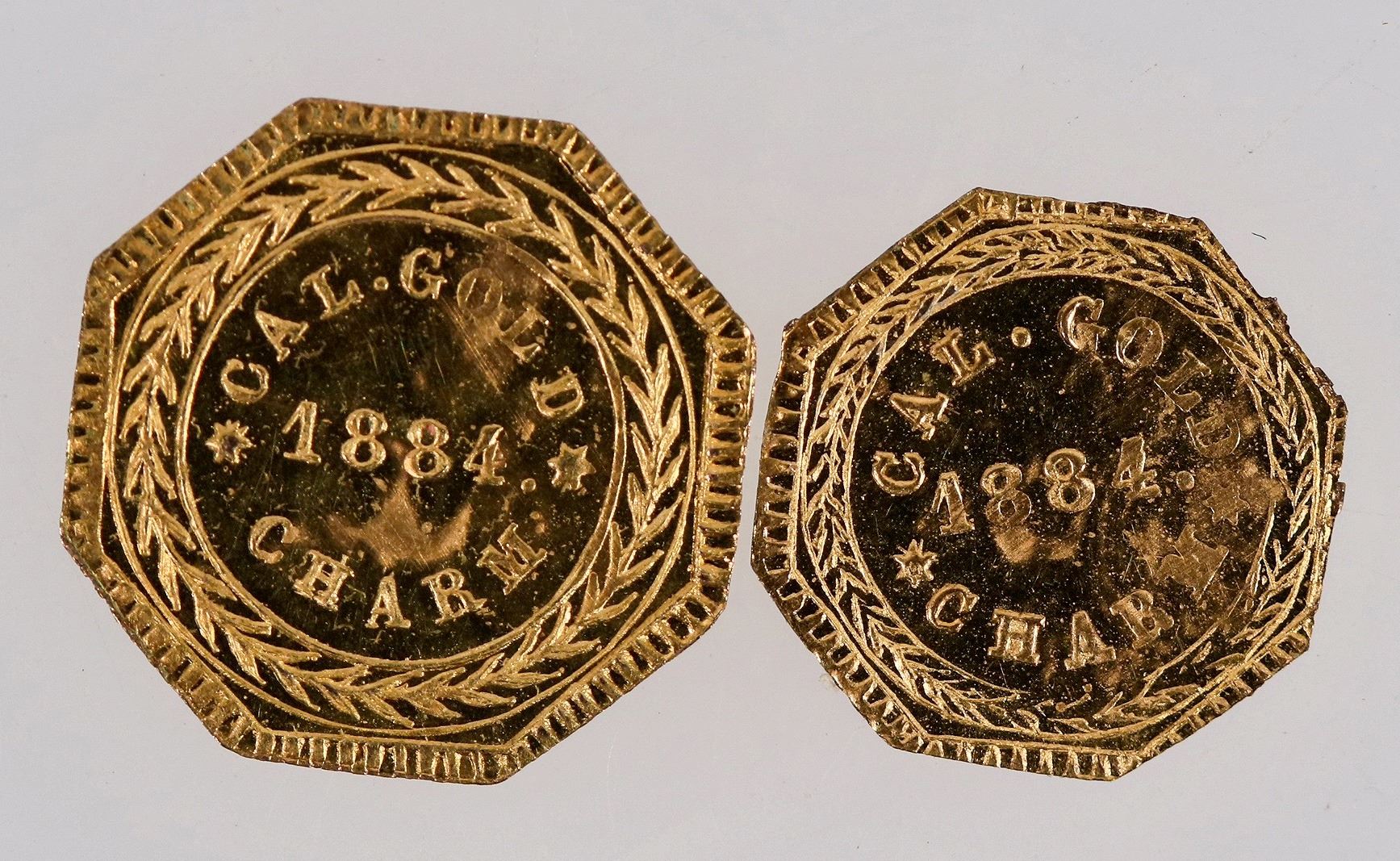 Two Cal Gold Charms (tokens) dated 1884. Uncirculated, octagonal, 10 mm.