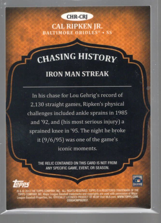 Cal Ripken Jr. Game-Used Patch 2013 Topps Chasing History #CHR-CRJ