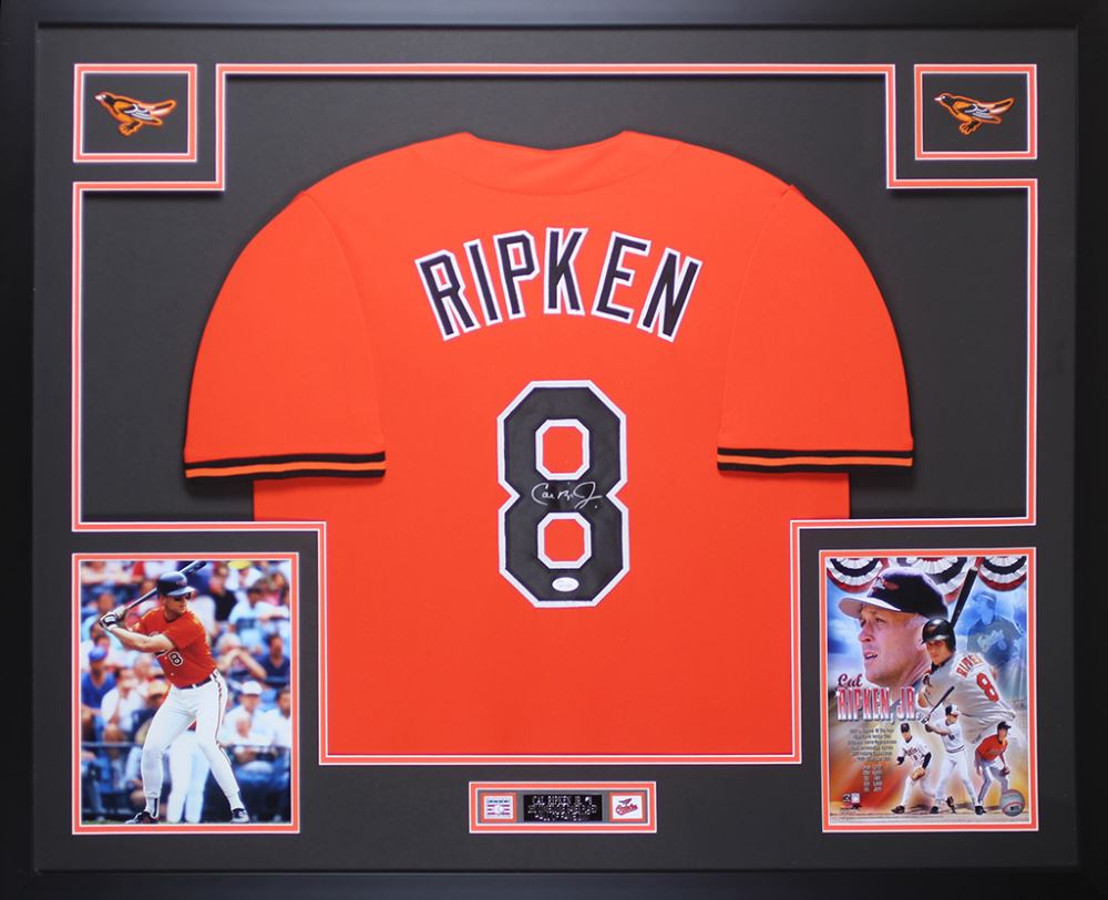 A beautifully framed autographed Cal Ripken Jersey. The autograph is certified by JSA and includes a sticker on the Jersey and a matching certificate attached to the back of the frame.