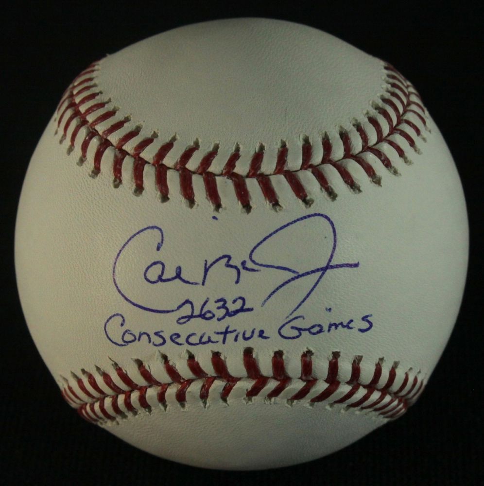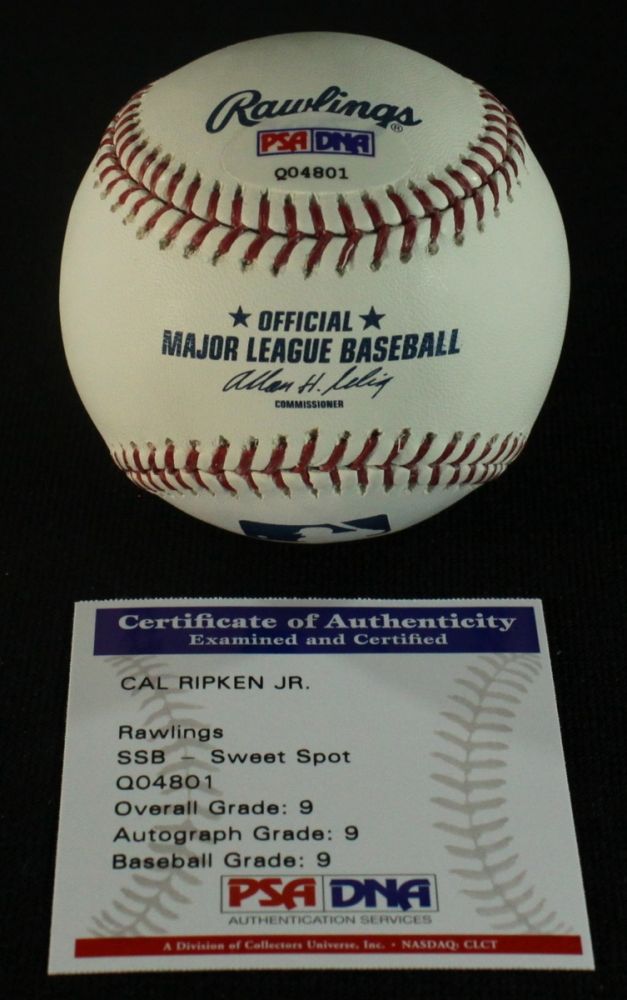 Official Major League Baseball. Hand-signed and inscribed in blue ink by Cal Ripken Jr. (Orioles HOF). Autograph includes official PSA/DNA hologram and matching COA for authenticity purposes.