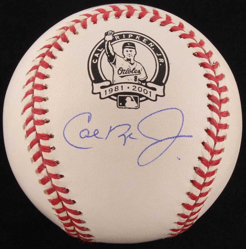 Rawlings Official Major League commemorative baseball. Hand-signed in blue ink pen by Cal Ripken Jr. (HOF). The baseball has been overall graded (PSA) 9.