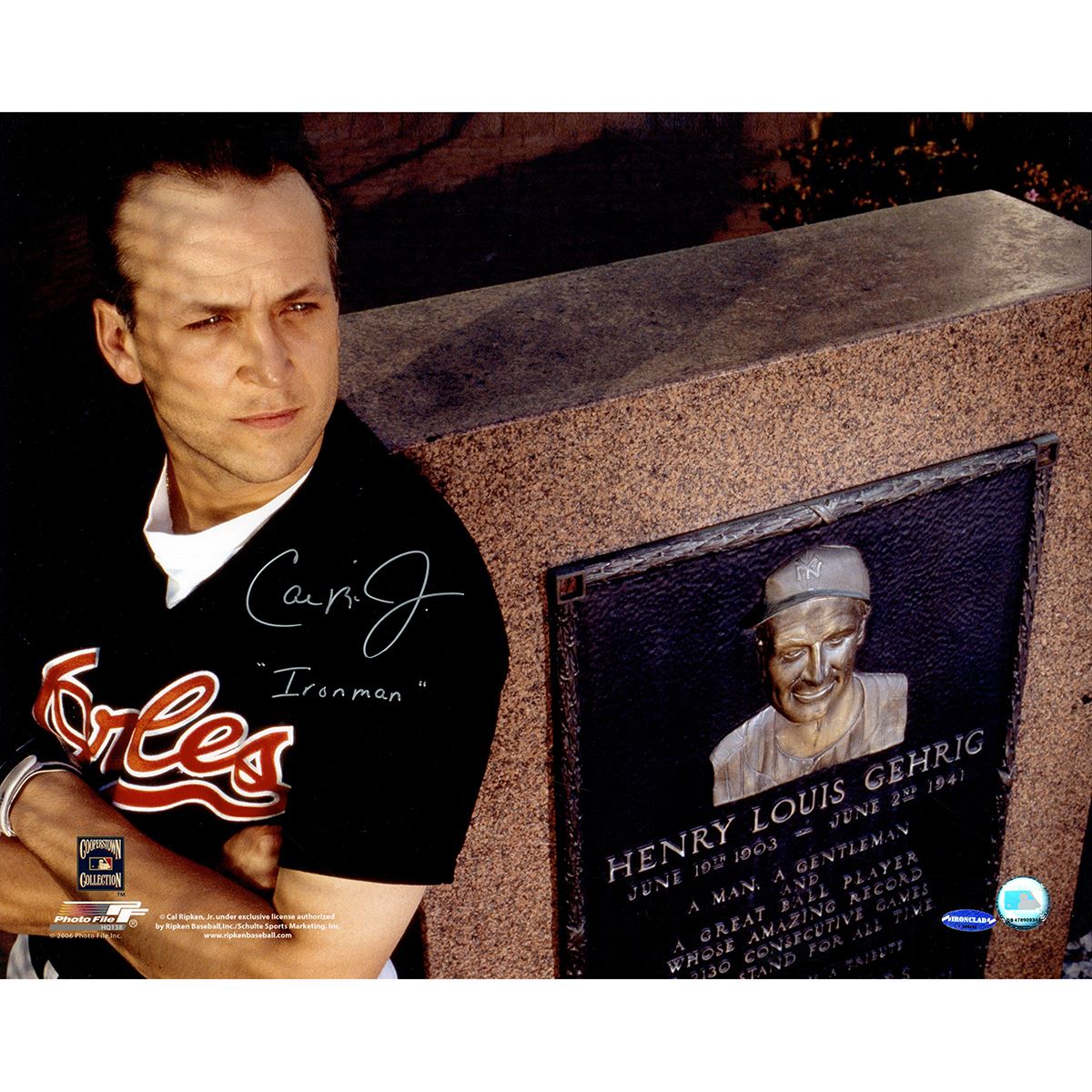 Cal Ripken Jr Signed w/ "Ironman" Inscrip. In front of Gehrig monument 16x20 Photo (Ironclad Holo)