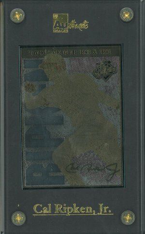 Cal Ripken, Jr. played his entire career (1981–2001) for the Baltimore Orioles. He is perhaps best known for breaking New York Yankees first baseman Lou Gehrig's record for consecutive games played, a record many deemed unbreakable. A 19-time All-Star and member of the 3000 hit club, Ripken is considered one of the best shortstops and third basemen to ever play the game. When inducted into the National Baseball Hall of Fame in 2007, he was a first ballot inductee with the third highest voting percentage (98.53%) in Hall of Fame history. This is a Cal Ripken, Jr unsigned Baltimore Orioles Two Time MVP 1983 & 1991 24 Karat Gold Signature Card. Limited Edition of 600. Slabbed to overall size of 3.5" x 5.5"