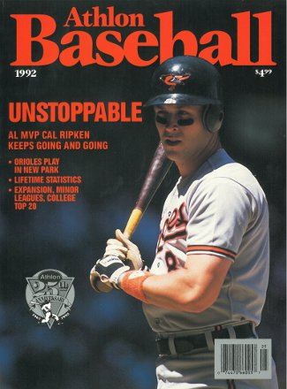 This is an Athlon Sports 1992 MLB Baseball Magazine with Baltimore Orioles Hall of Famer Cal Ripken, Jr. on the cover. This Preview has team analysis, predictions, lineups and more for the 1992 Season