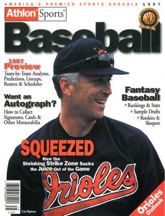 This is an Athlon Sports 1997 MLB Baseball Magazine with Baltimore Orioles Hall of Famer Cal Ripken, Jr. on the cover. This Preview has team analysis, predictions, lineups and more for the 1997 Season