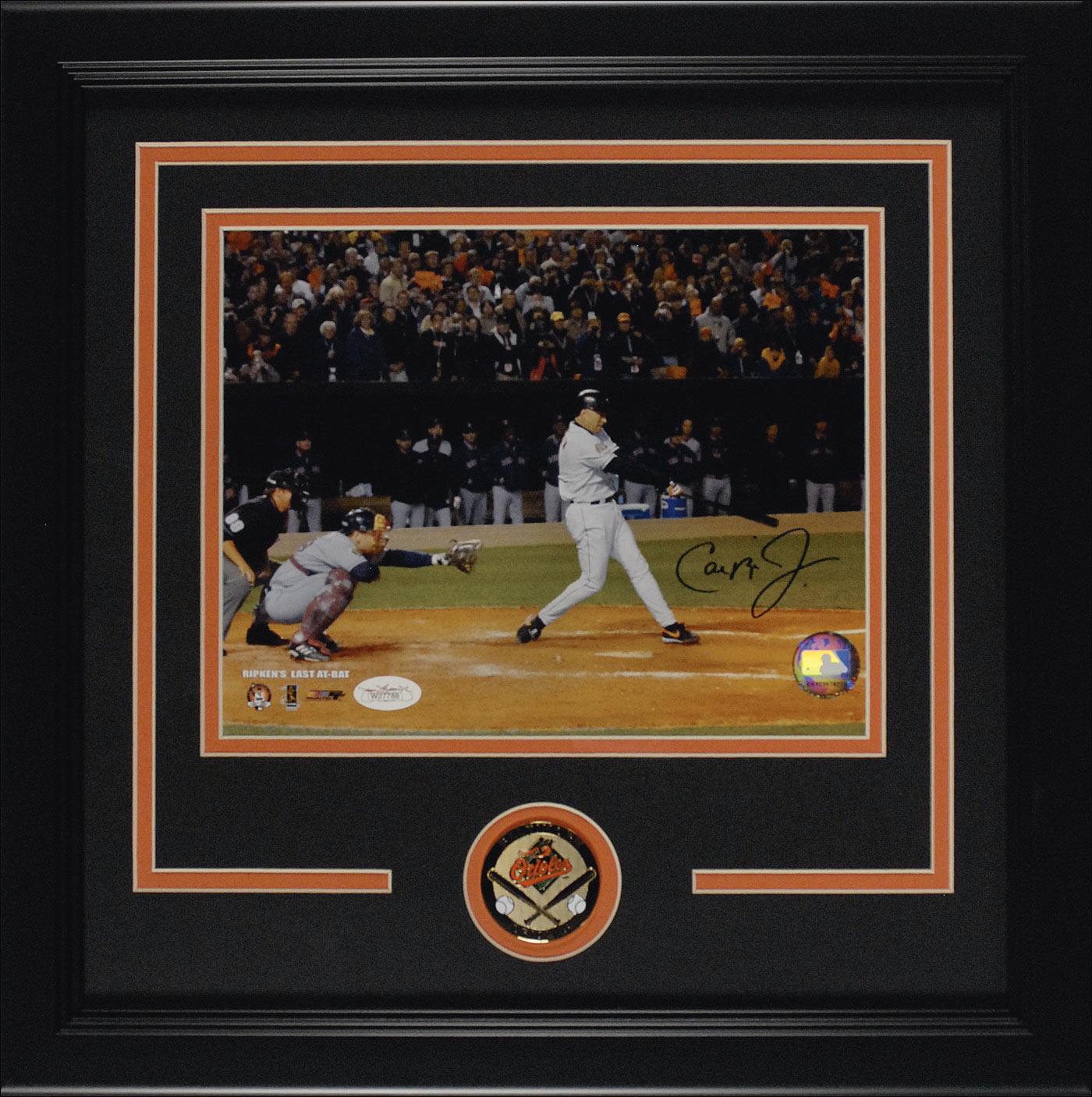 Color glossy 10 x 8 photo of Ripken’s last at bat, signed in blue felt tip. Double matted and framed with an Orioles pin, to an overall size of 16.25 x 16.25. In very fine condition, with a James Spence authentication label affixed to lower corner.