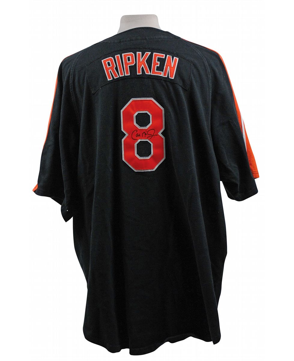 Two replica Orioles baseball jerseys, with sewn on numbers and letters, one by Majestic signed on the number on the back in silver ink; and one a Nike Cooperstown Collection, signed on the number on the back in black felt tip. In fine condition.