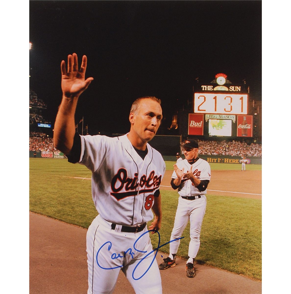 Color satin-finish 11 x 14 photo of Ripken acknowledging the Baltimore crowd after breaking Lou Gehrig’s record, signed in blue felt tip. In very fine condition.