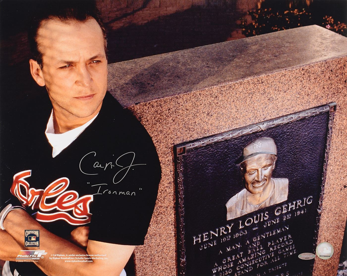 Color satin-finish 20 x 16 photo of Cal Ripken, Jr., posing next to a plaque honoring Lou Gehrig, the original record-holder of the most consecutive games played, signed in silver ink, "Cal Ripken, Jr., 'Ironman.'" In fine condition, with authenticity labels affixed to lower right corner.