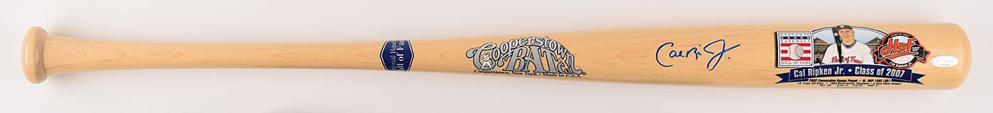 Official Cooperstown Bat Company 'Hall of Fame Series' commemorative baseball bat honoring Ripken's induction as part of the class of 2007, signed in blue felt tip on the barrel, "Cal Ripken, Jr." The bat depicts baseball's 'Iron Man' and features his career statistics. In fine condition, with an Ironclad authentication hologram affixed to the barrel. Accompanied by an Ironclad certificate of authenticity.