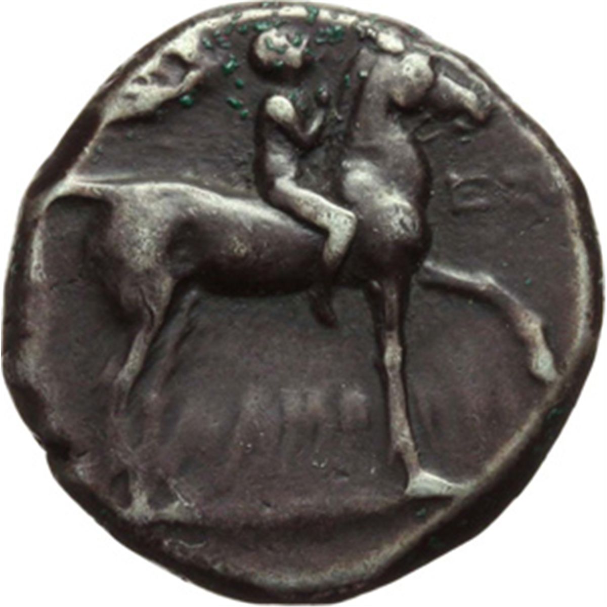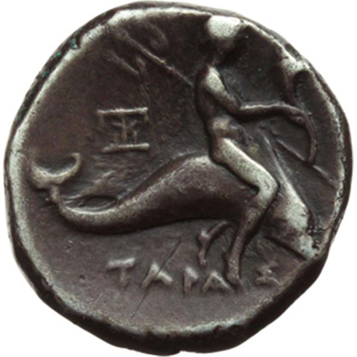 Mondo Greco. Italia Greca. Calabria, Taranto. Didracma, 272-235 a.C. D/ Cavaliere nudo che incorona il proprio cavallo al passo a destra. Sopra, Nike vola a destra e lo incorona. R/ TAPAΣ. Taras su delfino a destra tiene tridente e cornucopia. A sinistra, monogramma IΩMY. Vlasto 913. AG. g. 6.35 mm. 19.00 BB.