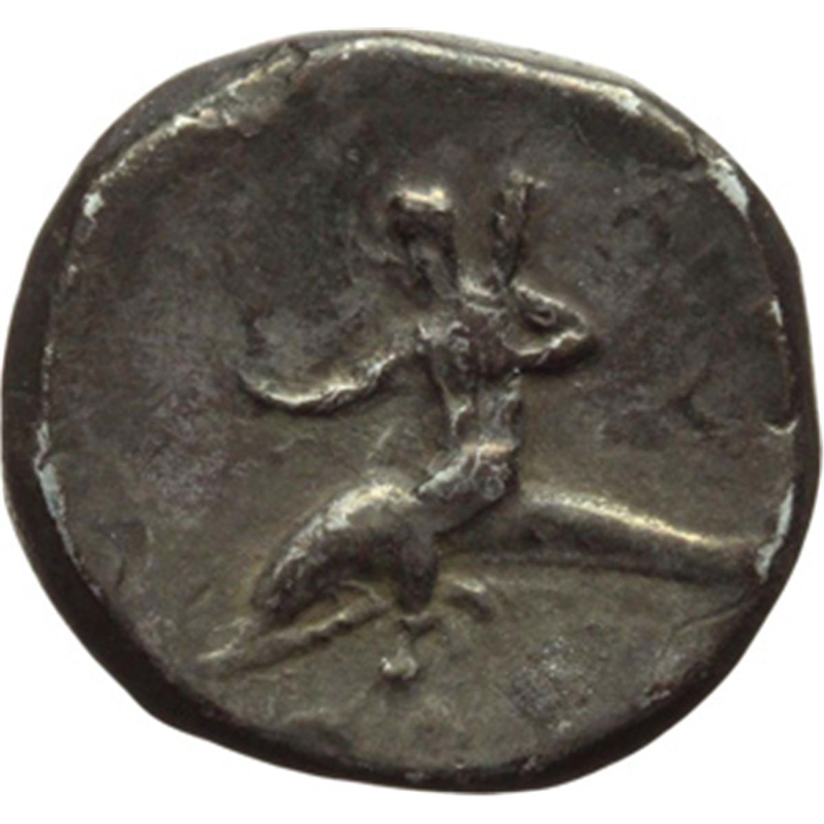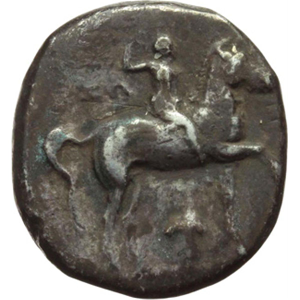 Mondo Greco. Italia Greca. Calabria, Taranto. Didracma, 281-272 a.C. D/ Cavaliere nudo, su cavallo al passo a destra, si incorona. Sotto, capitello ionico. R/ TAPAΣ. Taras su delfino a sinistra tiene conocchia e torcia. Cfr. Vlasto 803-808. AG. g. 6.30 mm. 20.00 BB.