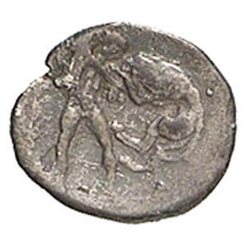 Italia Greca. Calabria-Taranto. Diobolo, 380-334 a.C. D/ Testa piccola di Athena a destra. R/ Ercole, stante a destra, combatte con un leone. A sinistra, clava. A destra, lettera A. Cfr. Vlasto 1276. gr. 0.91 AG. BB+.