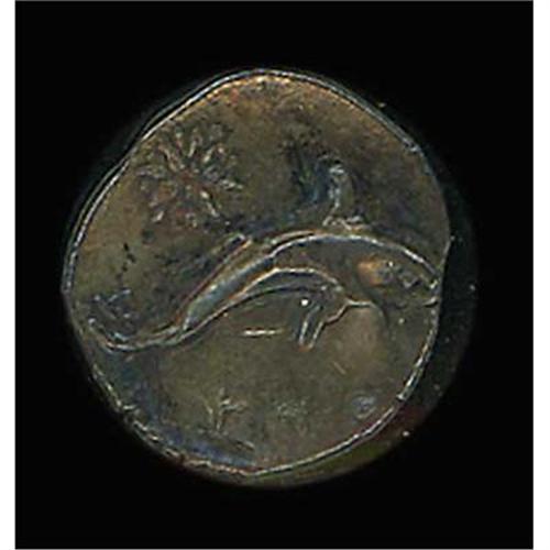 Scallop-shell. Reverse: Dolphin right; stellate pattern above. 0.61g.