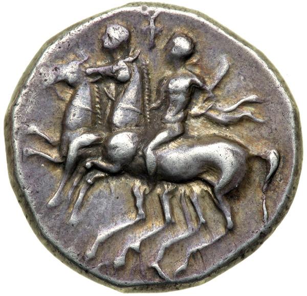 Calabria, Taras, c. 280-272 BC. AR Didrachm (or Nomos; 6.54 g). The Dioskouri riding left. Reverse: Taras riding left on dolphin; Nike flying right crowns Taras; below, waves. SNG ANS 1121-1128; Vlasto 773-777. Choice Very Fine.