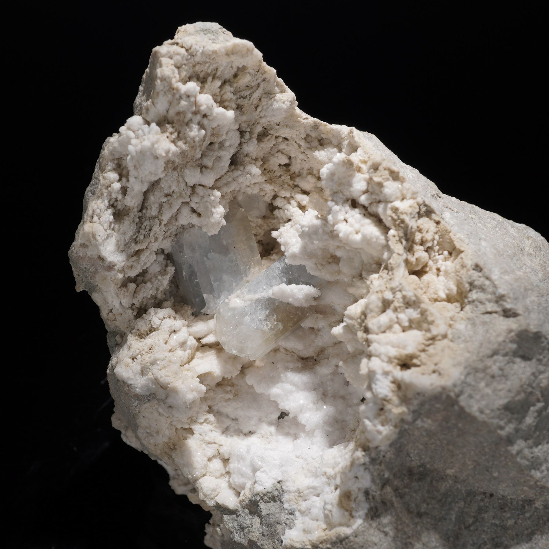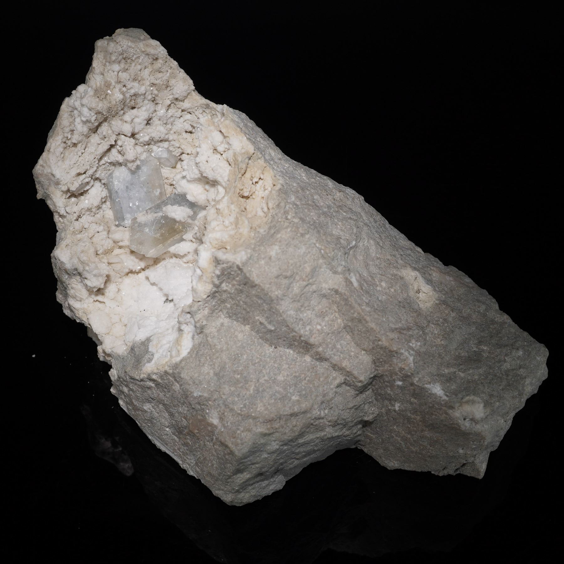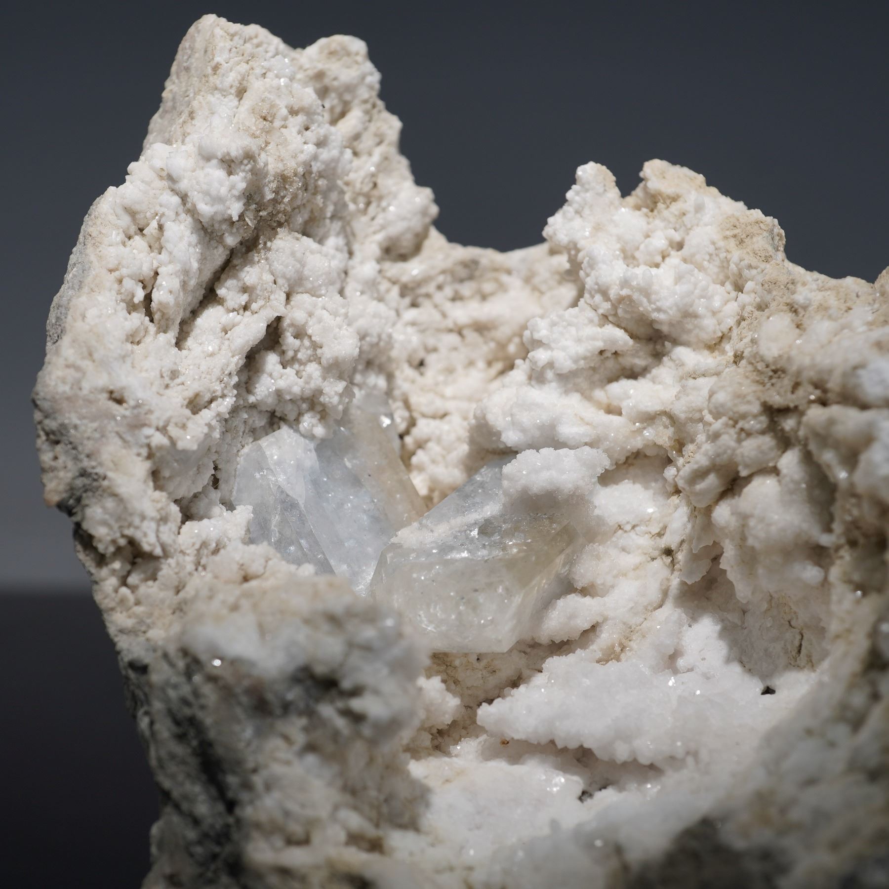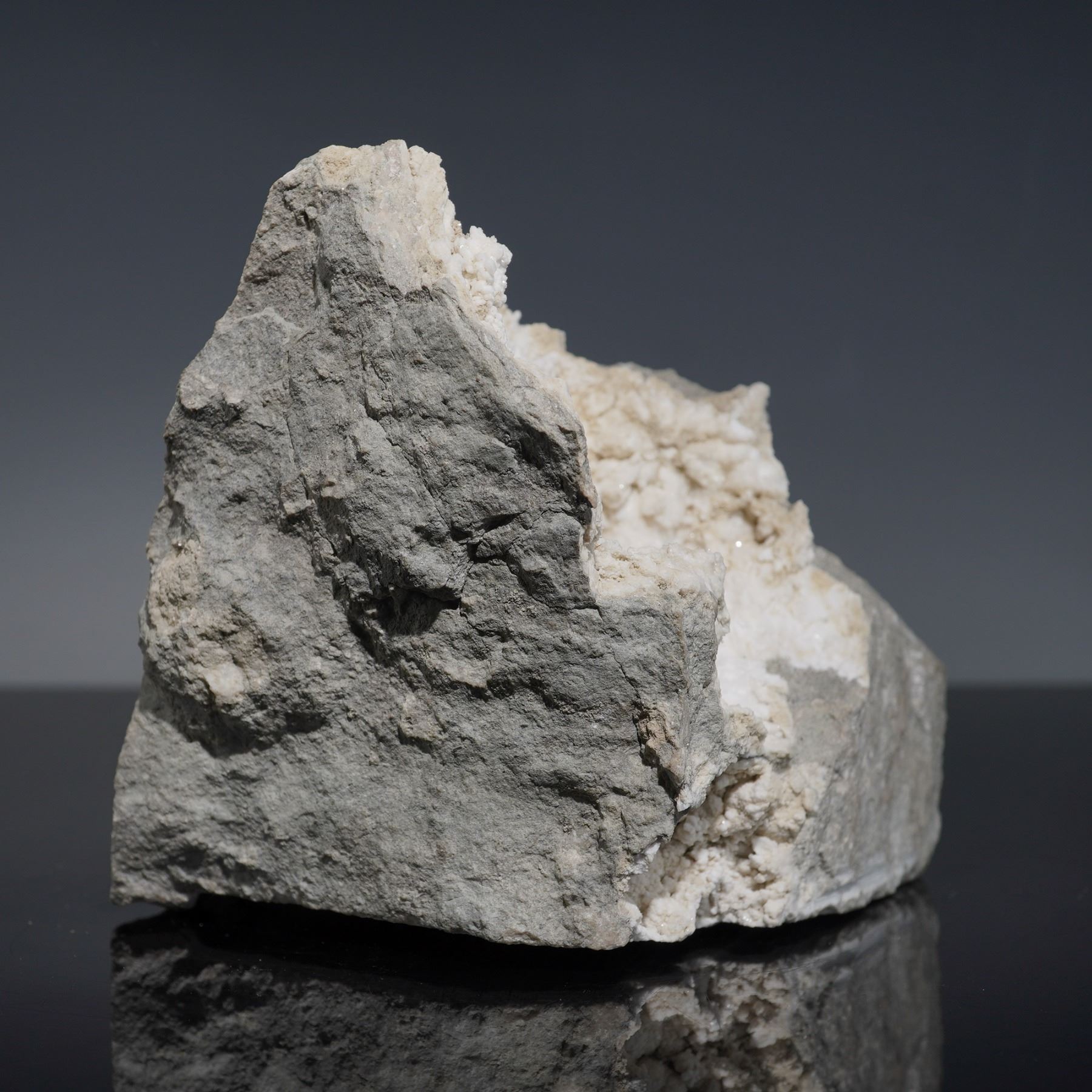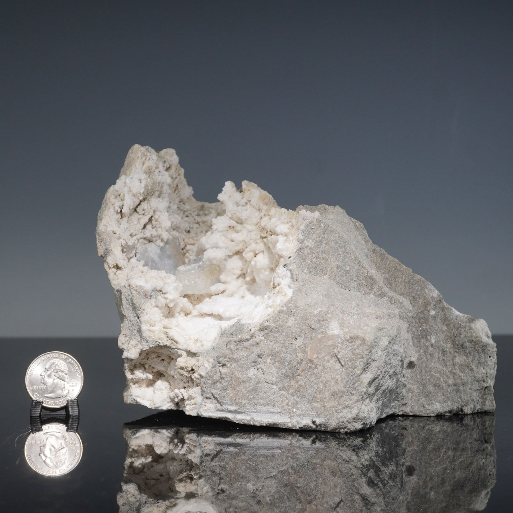 A captivating calcite specimen featuring lustrous, transparent to milky-white crystals nestled within a natural gray host matrix. The cluster reveals sharply defined rhombohedral calcite formations with subtle internal clarity, contrasting beautifully against the rough stone. The open cavity showcases delicate crystal growths, offering depth and sparkle when viewed under light. Collected from Russia, this striking piece highlights the elegance of natural mineral geometry and the serenity of calcite's soft, glacial tones. A fine display specimen for collectors of crystalline mineral formations.