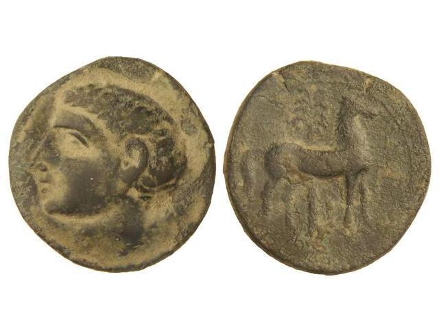 Calco. CARTAGONOVA. Anv.: Cabeza masculina a izquierda. Rev.: Caballo parado a derecha, detrás palmera. 10,80 grs. Pátina verde oscura. AB-552. MBC/MBC-.