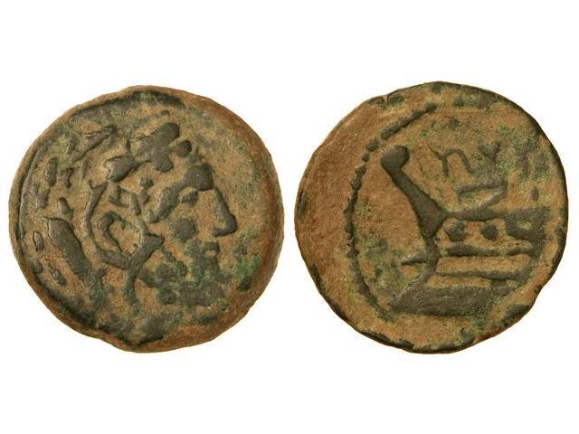 Calco. SEXI. Anv.: Cabeza barbada de Melkart a derecha, detrás clava. Rev.: Proa, encima leyenda púnica. 10,10 grs. Pátina verde. RARA. AB-2221. MBC.