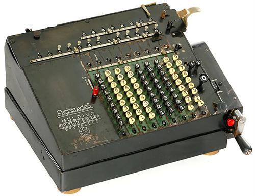 "Archimedes Muldivo", 1915 Vierspezies-Staffelwalzen-Rechenmaschine mit Direktanzeige von Reinhold Pöthig, Glashütte/Sachsen. 9-stelliges Volltastenfeld mit 9-stelligem Direktanzeige-Einstellwerk, 13-stelliges Resultat- und 8-stelliges Umdrehungszählwerk. - Literatur: Martin, S. 93.