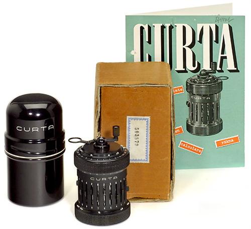 "Curta Typ II" (schwarz), 1948 Miniatur-Vierspezies-Staffelwalzen-Rechenmaschine - konstruiert vom Wiener Dipl.-Ing. Curt Herzstark, der sie in Liechtenstein produzierte. Seriennummer 503879. Mit Original-Metalldose, Bedienungsanleitung und Versandkarton.