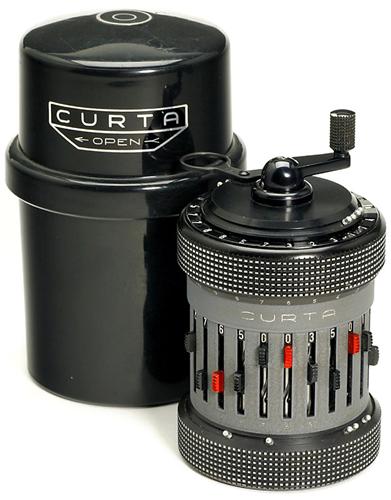 Curta Type II (Grey/Black), 1948 Highly desirable stepped drum calculating machine for all 4 arithmetical operations by legendary Curt Herzstark. With original plastic box. - Top condition!<Br>
