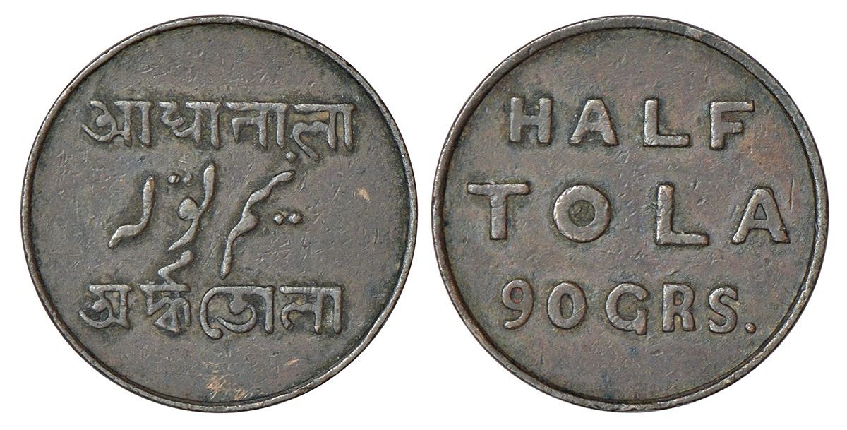 Calcutta mint, copper ½ tola token, 5.80g. Obv: Value in Devanagari, Urdu and Bengali. Rev: Value in English 90 GRS.