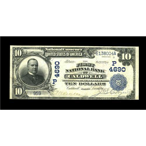 <B>Caldwell, ID</B></I> - $10 1902 Date Back Fr. 620 <B>The First NB</B></I> Ch. # (P)4690<BR>This piece is listed in the census as a $5, which it is not, and as Extremely Fine, which it also is not. It is, however, a more than acceptable Date Back which grades a nice <B>Fine-Very Fine.</B></I>