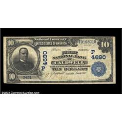 Caldwell, ID - $10 1902 Plain Back Fr. 628 The First NB Ch. # 4690A nice Fine+ example, although with more than a few inconspicuous pinholes. Important notice: We expect to be auctioning lots at the rate of 200-250 per hour. Sometimes eBay Premier live bid software cannot keep up with that pace, so we strongly recommend that you place a realistic proxy bid now as insurance to avoid disappointment. Also please note that all Heritage/CAA lots purchased through eBay Premier carry a 20% Buyer's Premium. Please make sure you read the Terms and Conditions.