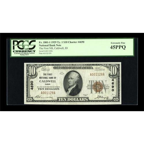 <B>Caldwell, ID</B></I> - $10 1929 Ty. 1 <B>The First NB</B></I> Ch. # 4690<BR> This note is the nicest we have offered from here in some time. <B>PCGS Extremely Fine 45PPQ</B></I>.<BR><BR><b>Shipping:</b> Coins & Currency (<a target="_blank" href="http://www.heritageauctions.com/common/shipping.php">view shipping information</a>)
