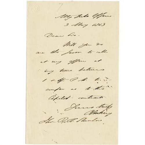 <B>Caleb Cushing Autograph Letter Signed as Attorney General of the United States</B></I> "<I>C Cushing</B></I>". One page, 4.5" x 7", [Washington], May 3, 1853, to Richard H. Stanton, fine condition. <BR><BR><BR><b>Shipping:</b> Flat Material, Small (<a target="_blank" href="http://www.heritageauctions.com/common/shipping.php">view shipping information</a>)